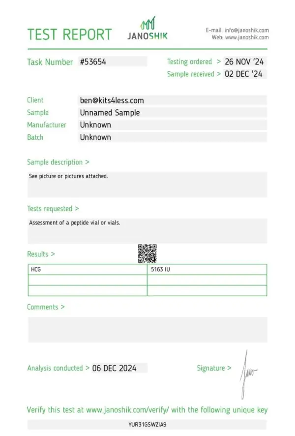 Each vial contains 5000 IU of lyophilized HCG powder, requiring reconstitution before use. 10 vials per kit.