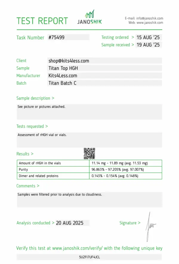 Titan HGH is the crown jewel of our peptide line — a highly anticipated release engineered for maximum purity, potency, and performance. Each kit delivers 10 vials of avg 38.5 IU pharmaceutical-grade recombinant Human Growth Hormone (rHGH), trusted by athletes, bodybuilders, and optimization enthusiasts for its unmatched results in muscle growth, fat loss, recovery, and overall vitality.